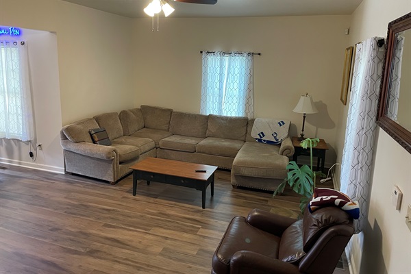 The main living area at the Durham Bull Pen has a large 55" Smart TV for streaming your services, a bunch of comfy seating to relax and a dining area.